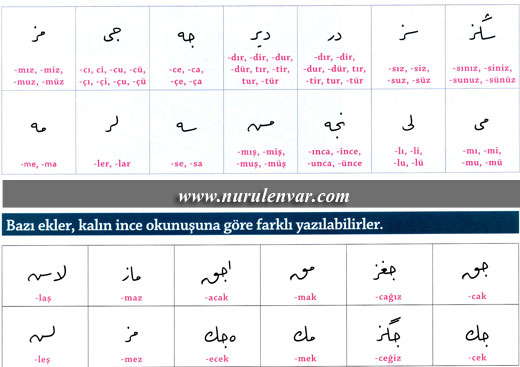 Osmanlıcada ekler kendi başına ayrı bir bölüm olarak değerlendirilmektedir. Zira ekler, kendi içinde bazı kurallara tabi olmakta, kelime kökleri için öğrendiğimiz kurallara her zaman uymamaktadırlar. Çoğu ekler klişe bir yapıya sahip olup farklı okunuşları da aynı şekil ile ifade edilmektedir.
